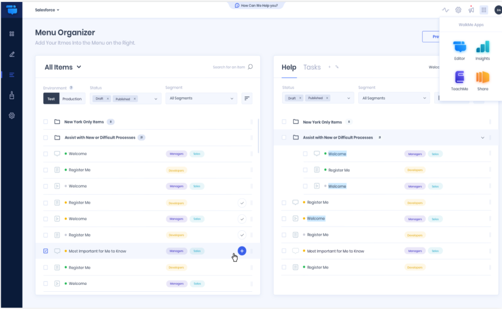A new and improved version of the existing menu organizer. An overall improved Builder experience for managing the WalkMe Menu, which in turn, improves the end-user's experience with WalkMe.