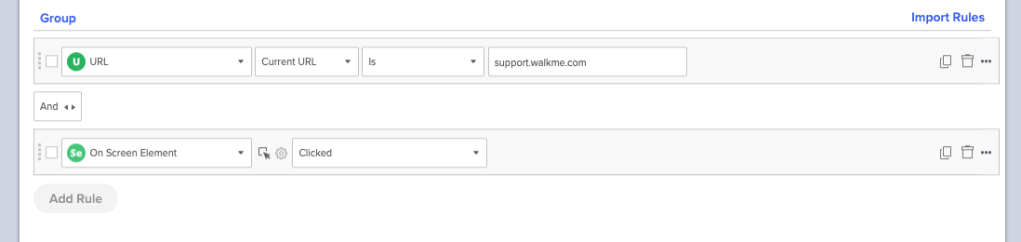 - Supported types: Currently available for URL, On-Screen Element, jQuery, User Data, Workday, and Active Directory rule types