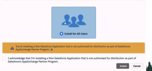 During the process of installing WalkMe, you may receive a message from alerting you that you are installing a non-Salesforce Application. This message will be visible when installing WalkMe on Lightning, Salesforce Communities, or setting up an Activate Now banner.