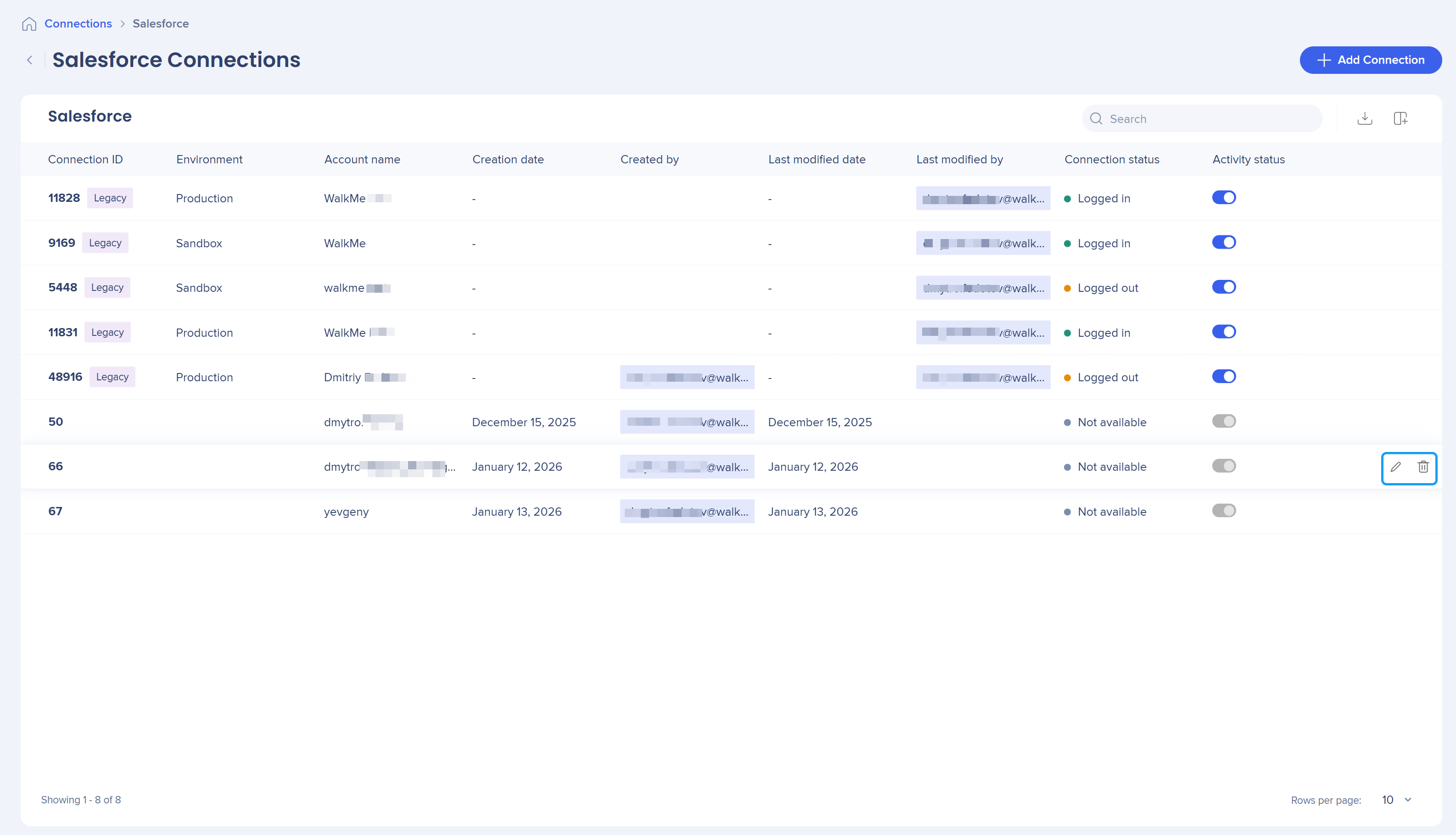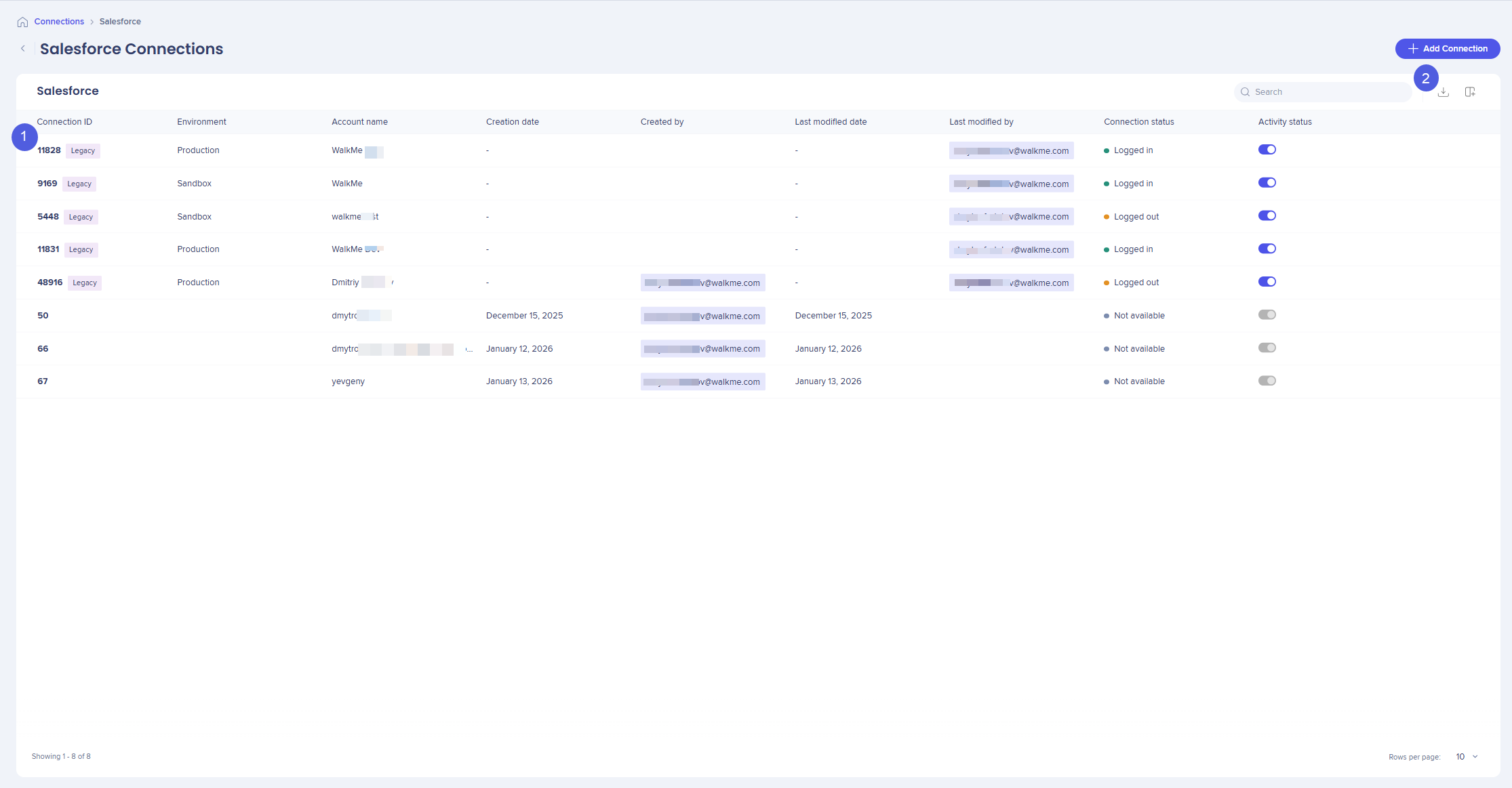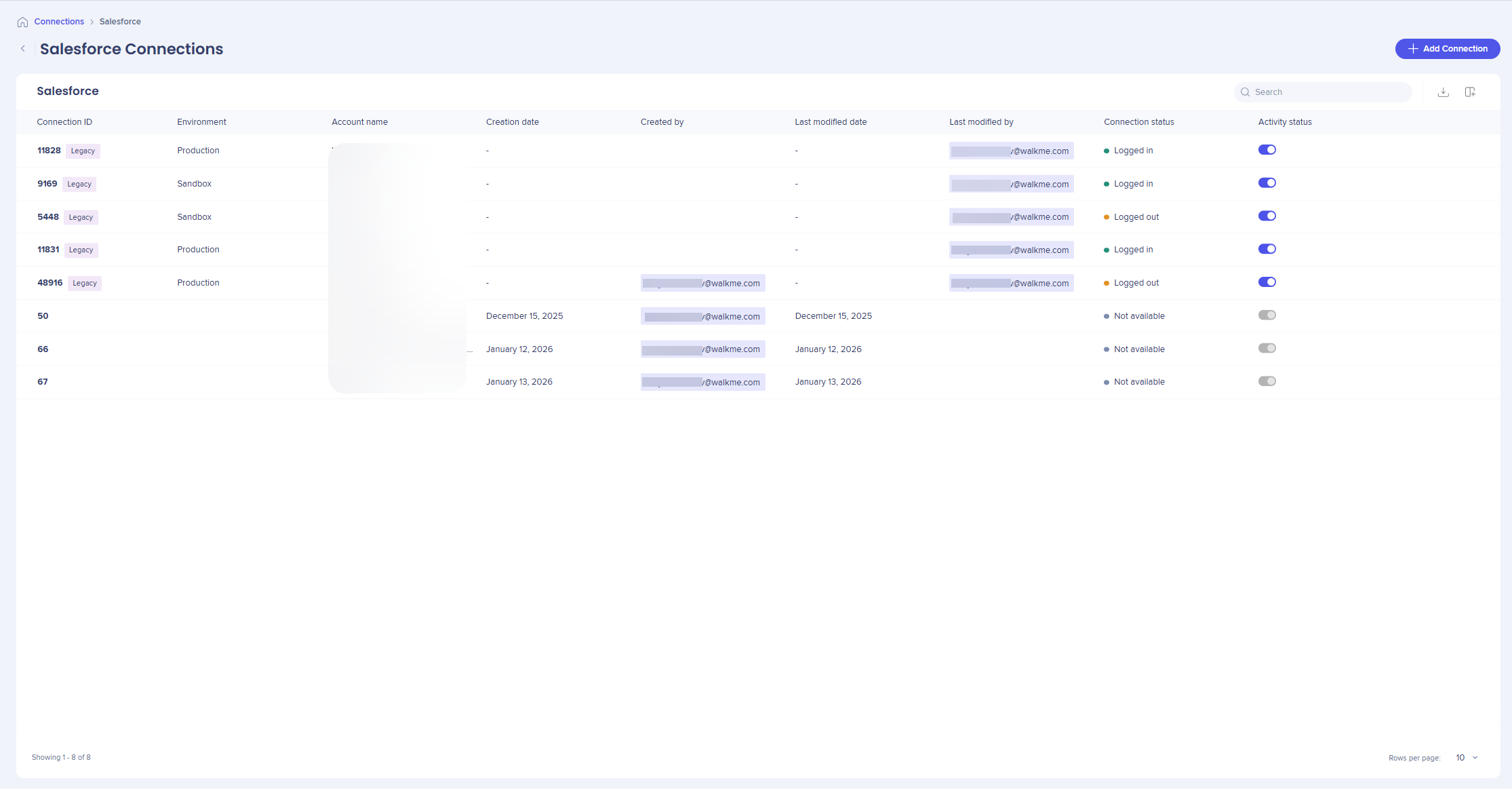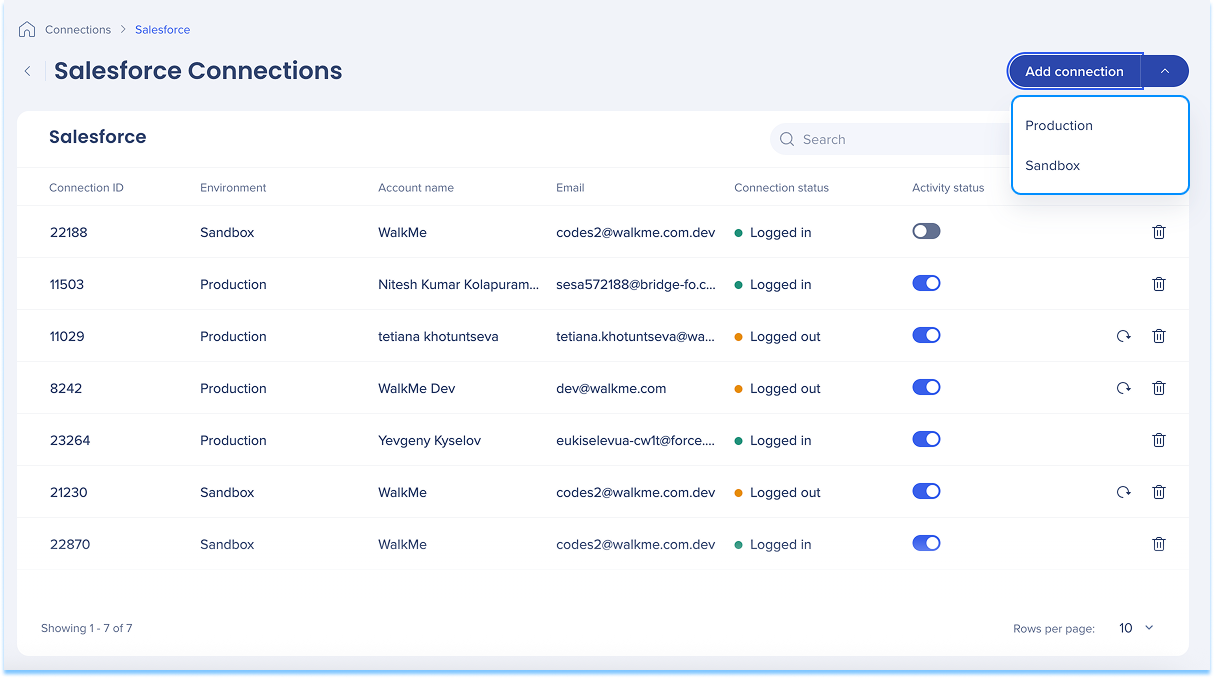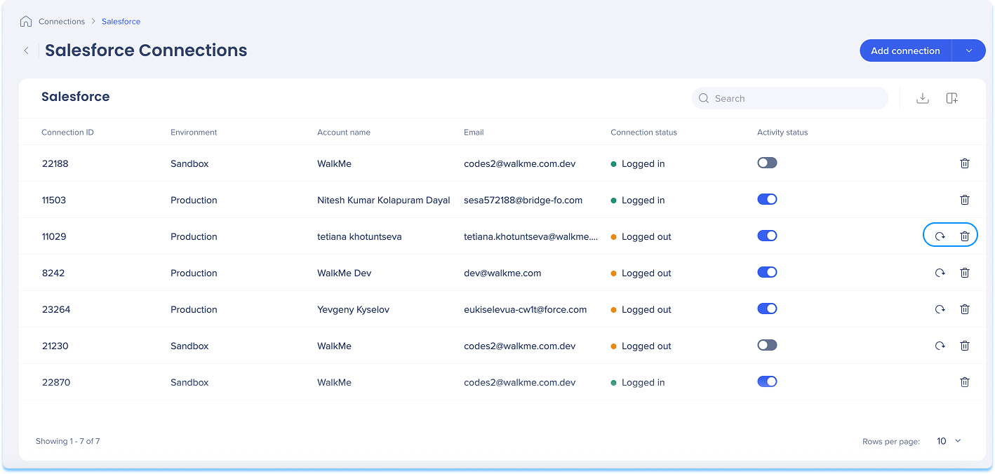 The Salesforce Connection page lets you connect Salesforce accounts to WalkMe and manage existing Salesforce connections. Use this page to add new connections, monitor connection status, and reconnect or remove existing Salesforce accounts.
