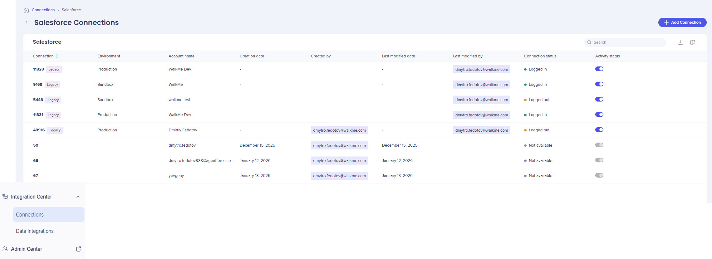 You can access the Salesforce Connections page from the Integration Center app in the WalkMe Admin Center.