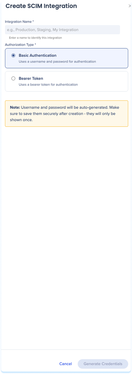 If you selected Basic Authentication, a popup opens displaying the SCIM credentials generated for this integration: