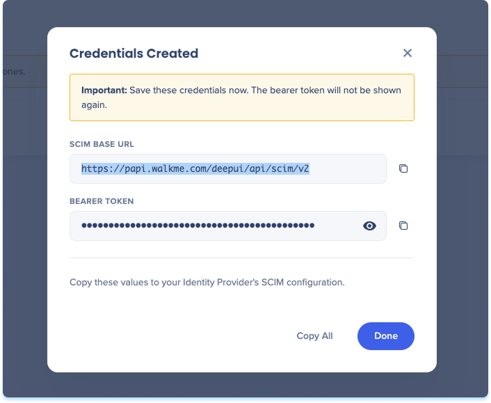 If you selected Bearer Token, a popup opens displaying the SCIM credentials generated for this integration: