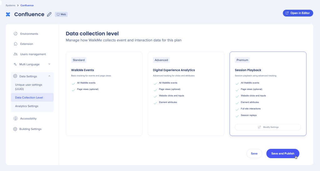 You can access and modify these settings from the Data Collection Level page in the Admin Center.