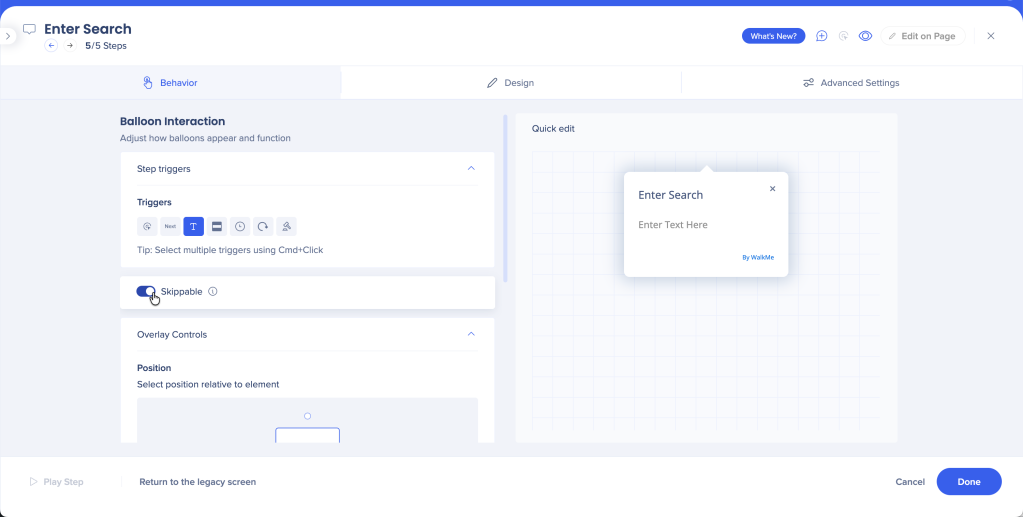 Skippable steps let Smart Walk-Thrus continue when a step's target element is not found. By marking a step as skippable, you ensure that the flow progresses smoothly even when elements appear conditionally or vary by user role.