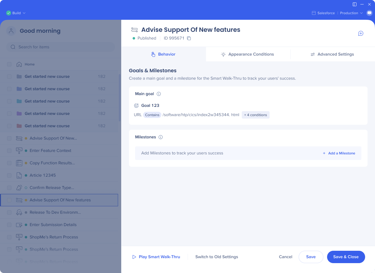 Smart Walk-Thrus provide step-by-step on-screen guidance through a process using balloons to guide the user. This article will guide you through the basics of building a Smart Walk Thru. For introduction to Smart Walk-Thrus see this article: