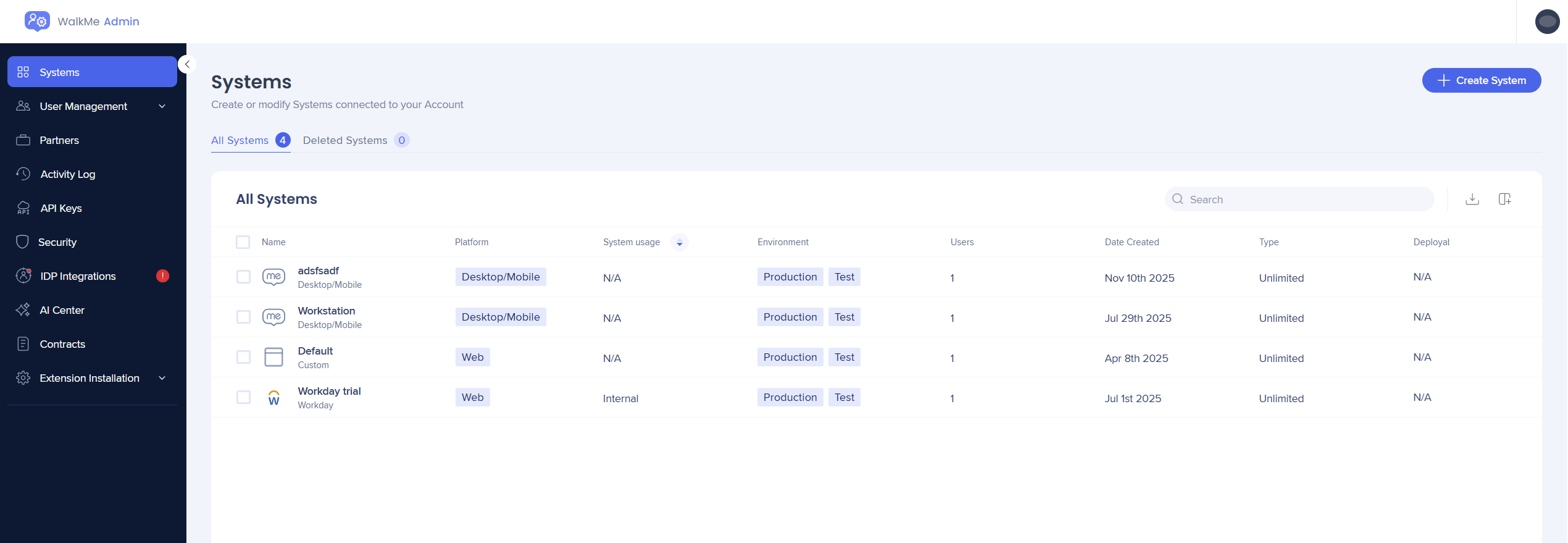To access the system management settings, open the Systems page in the WalkMe Admin Center. Choose the link for your data center.