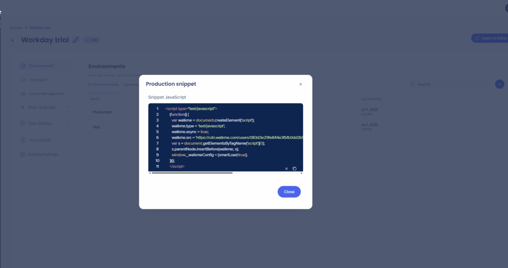 WalkMe's Admin Center offers a unified tool that brings all your essential system settings into a single, user-friendly interface. This centralized view simplifies system management, helping you configure and maintain systems with greater ease and efficiency.