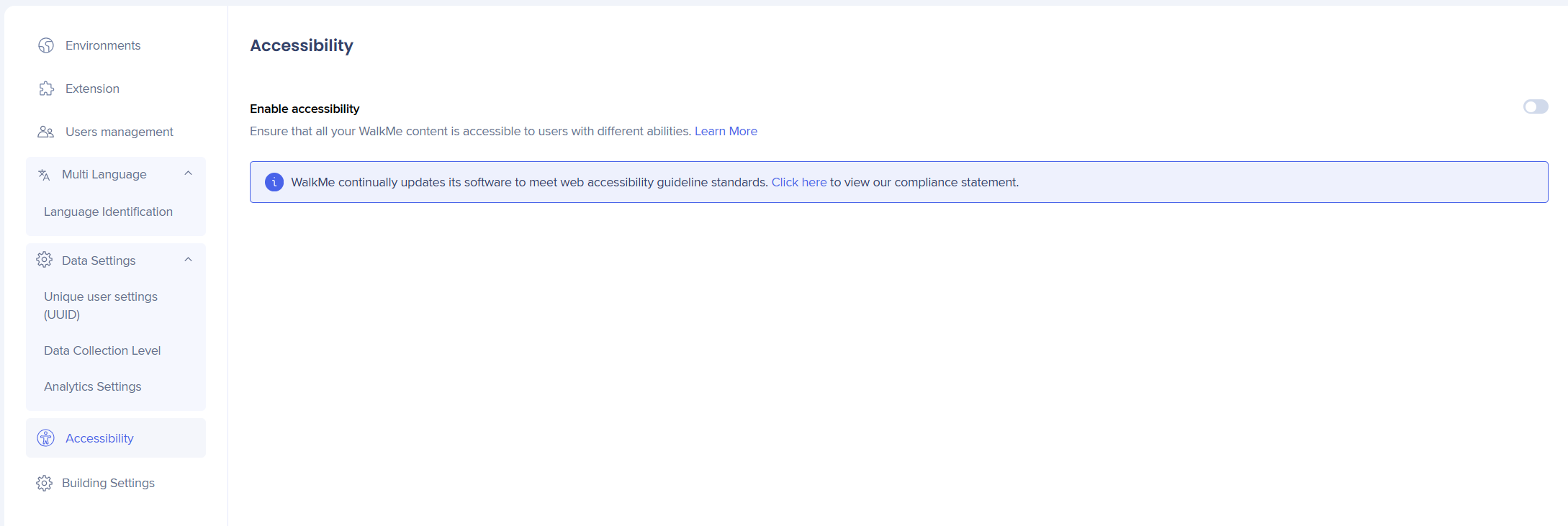 If accessibility has been enabled at the account level by a WalkMe employee through Backoffice , the toggle will be turned ON by default