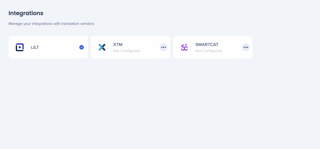 The Integrations page, located in Multi-Language in the WalkMe Console, lists all connected translation vendors available in your account. From here, you can set up connections, manage authentication, and define your default vendor.