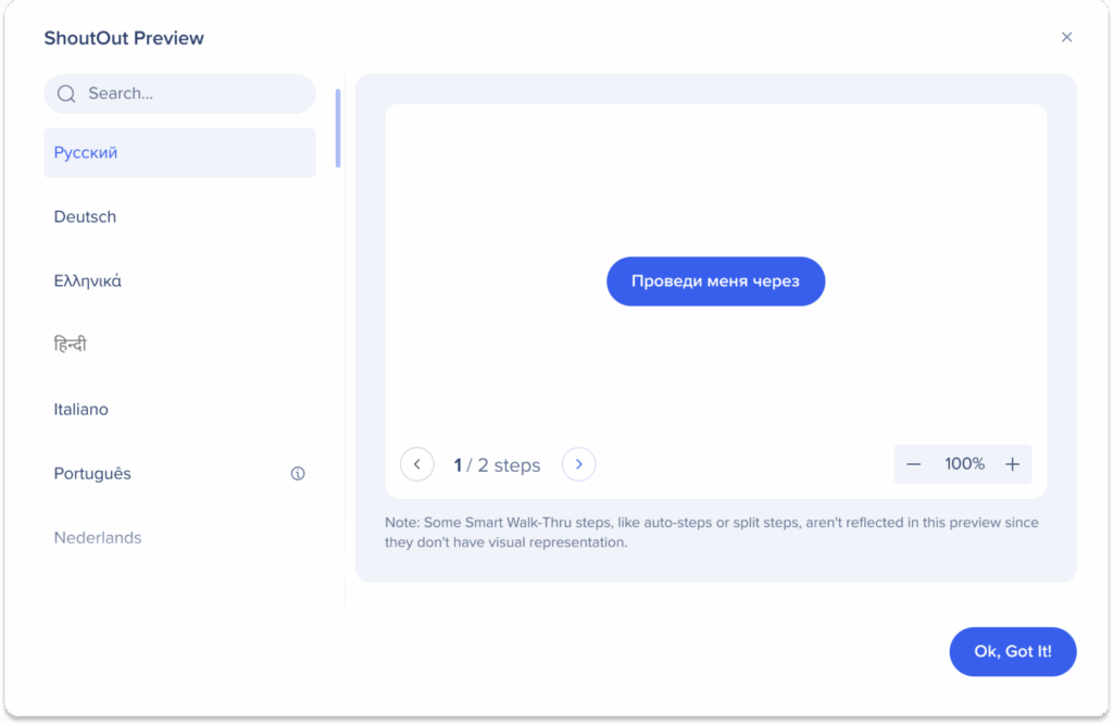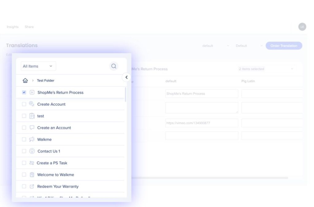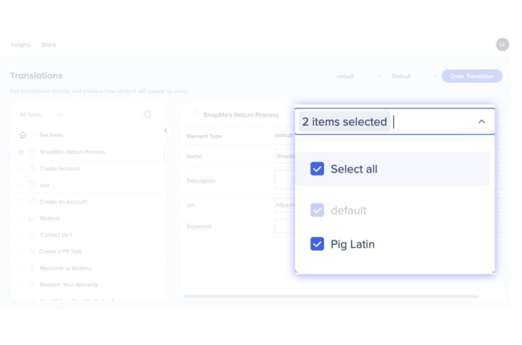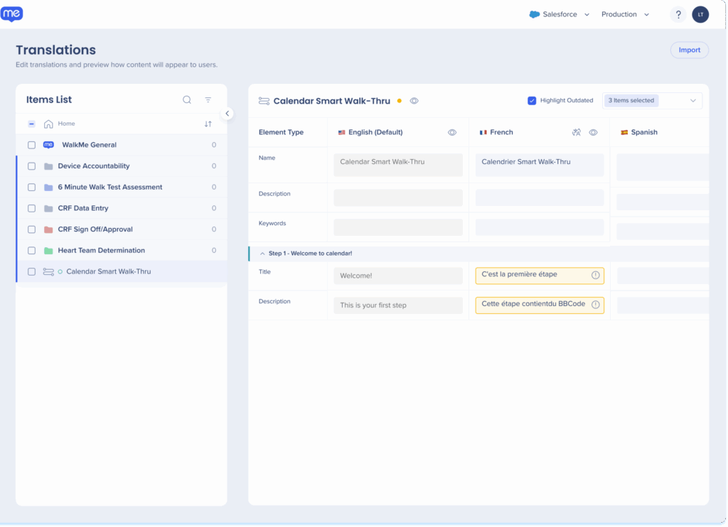 The Translations page lets you edit and manage how your WalkMe content appears in different languages. Here, you can view, update, and preview translations for all items in your account to ensure a consistent multilingual experience.
