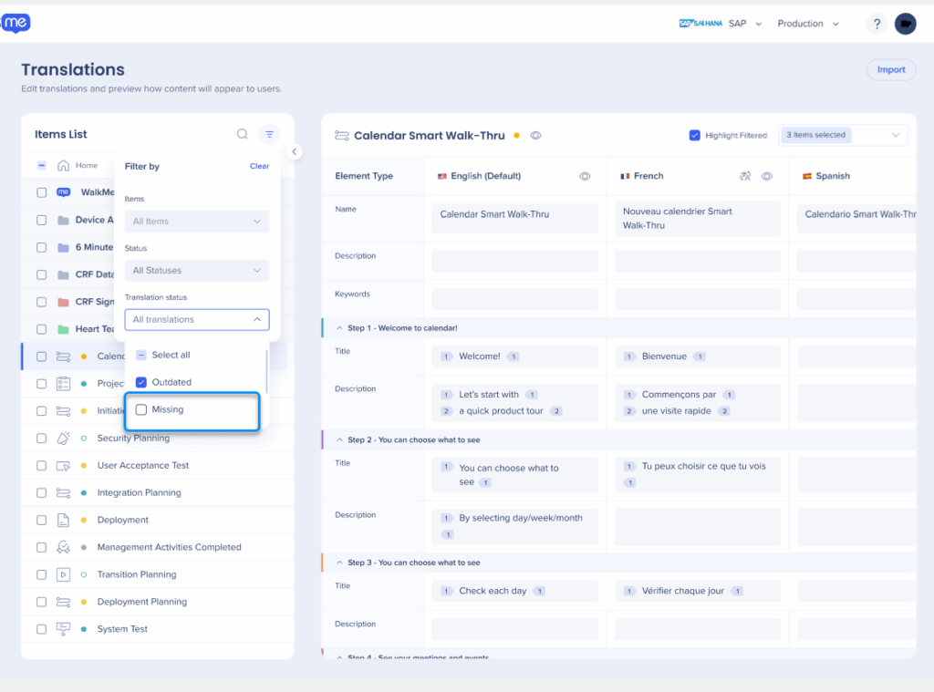 - Filter translations: Identify items with missing or outdated translations to keep your content current