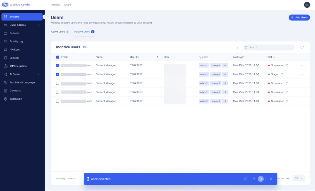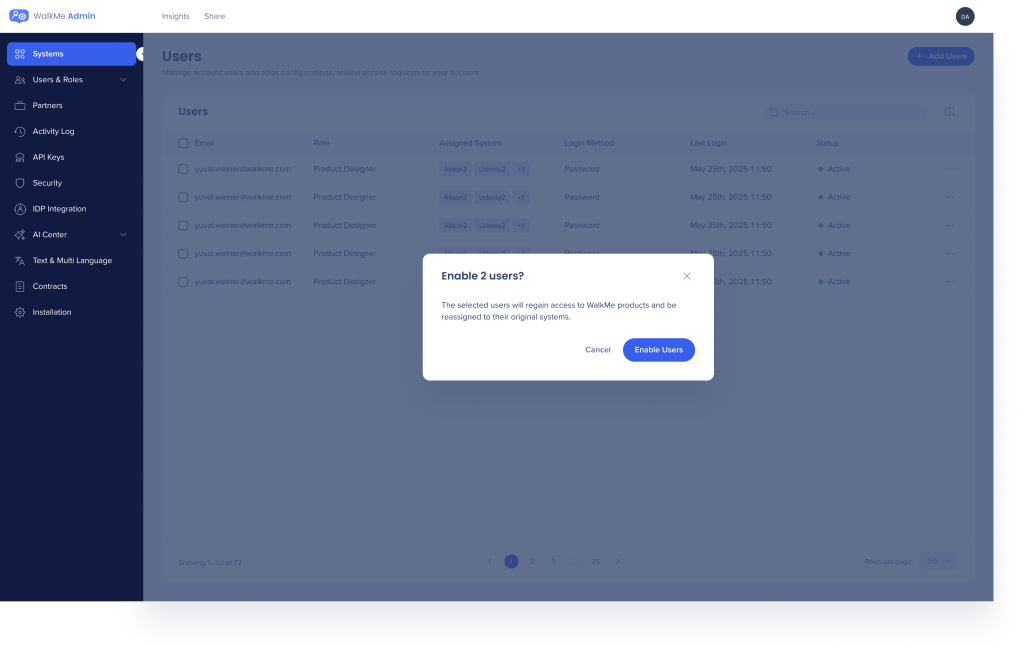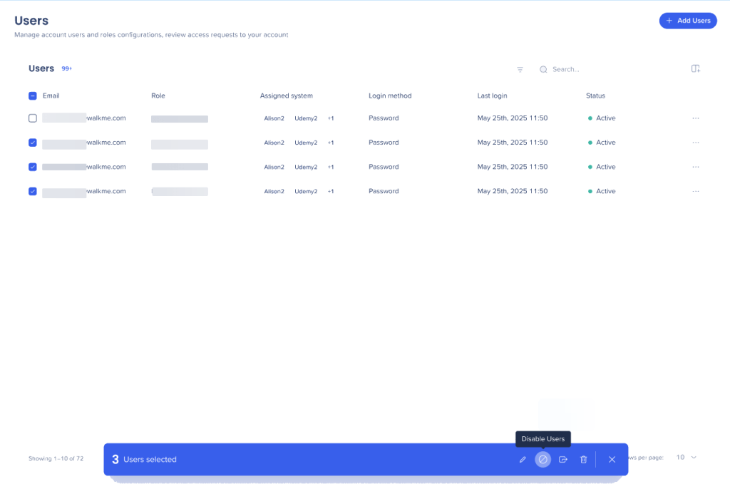 The Users page allows you to add, view and edit your WalkMe users. Access it from admin.walkme.com under User Management.