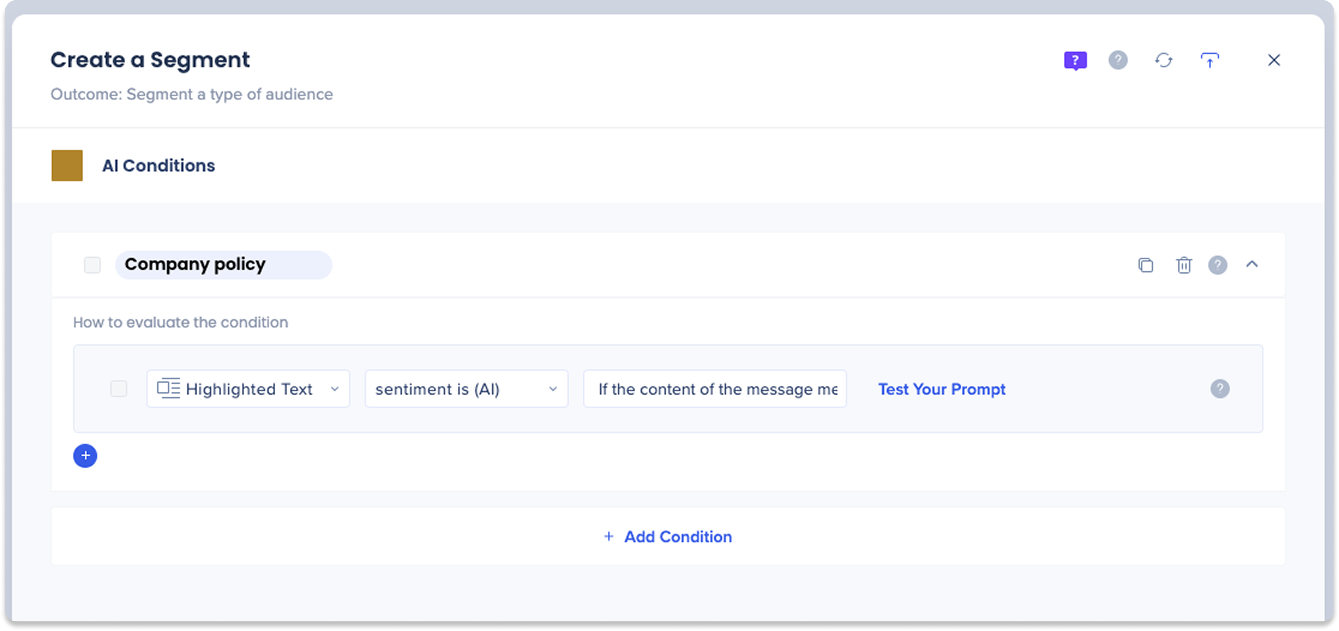 Instead of building complex, exact-match logic rules, builders use natural-language operators in the Condition Builder. When the AI Condition evaluates to true, it triggers specific actions or skills to appear within the Action Bar.