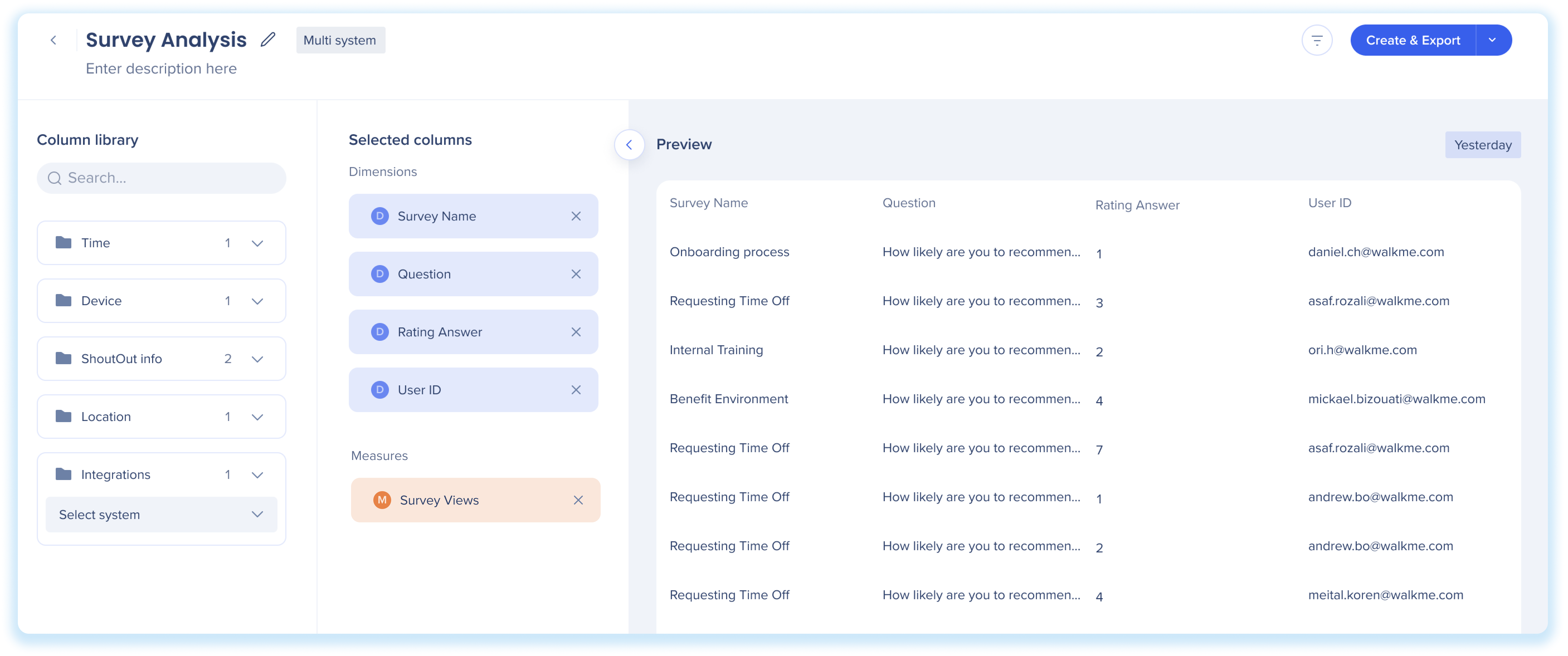 WalkMe Surveys in the console enhance WalkMe's existing survey functionality by providing advanced, AI-driven survey creation along with improved tools for survey distribution and analytics.