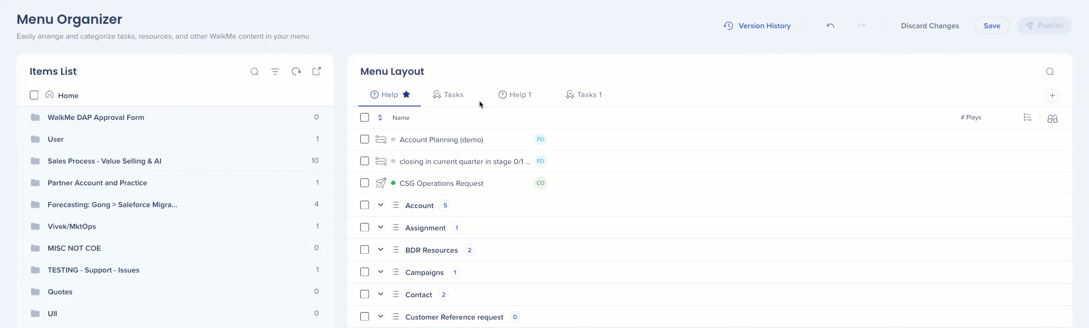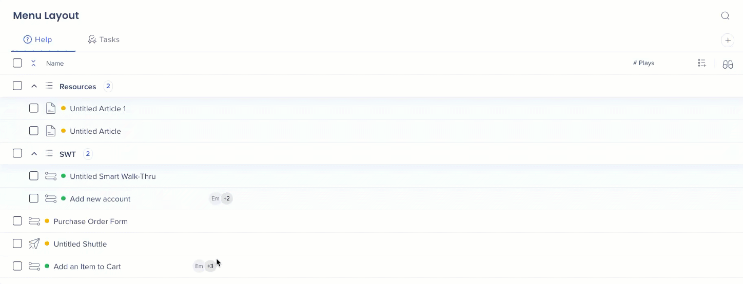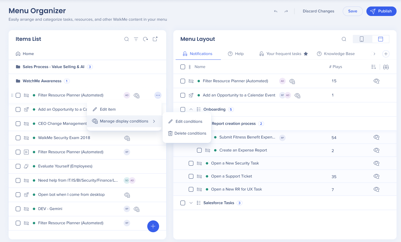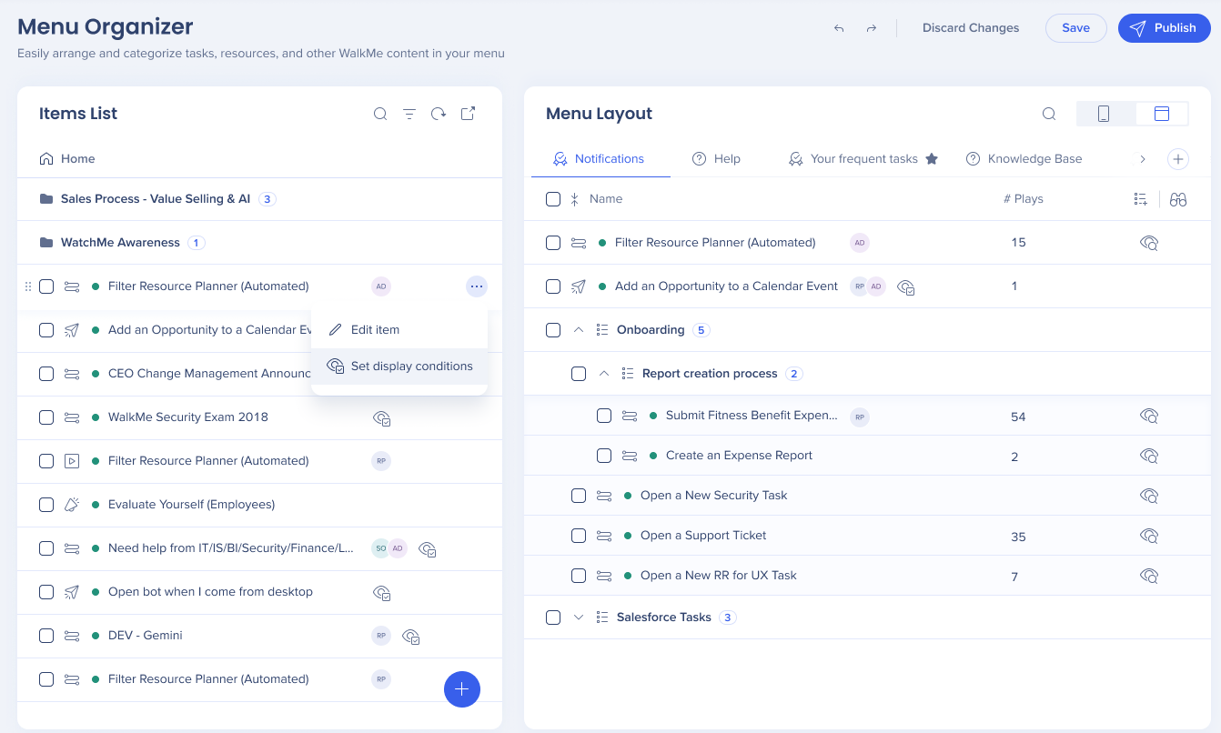 The WalkMe Menu Organizer is your workshop for building and managing your WalkMe Menu. The menu organizer displays all of the resources, onboarding tasks, and Smart Walk-Thrus that are in your editor.