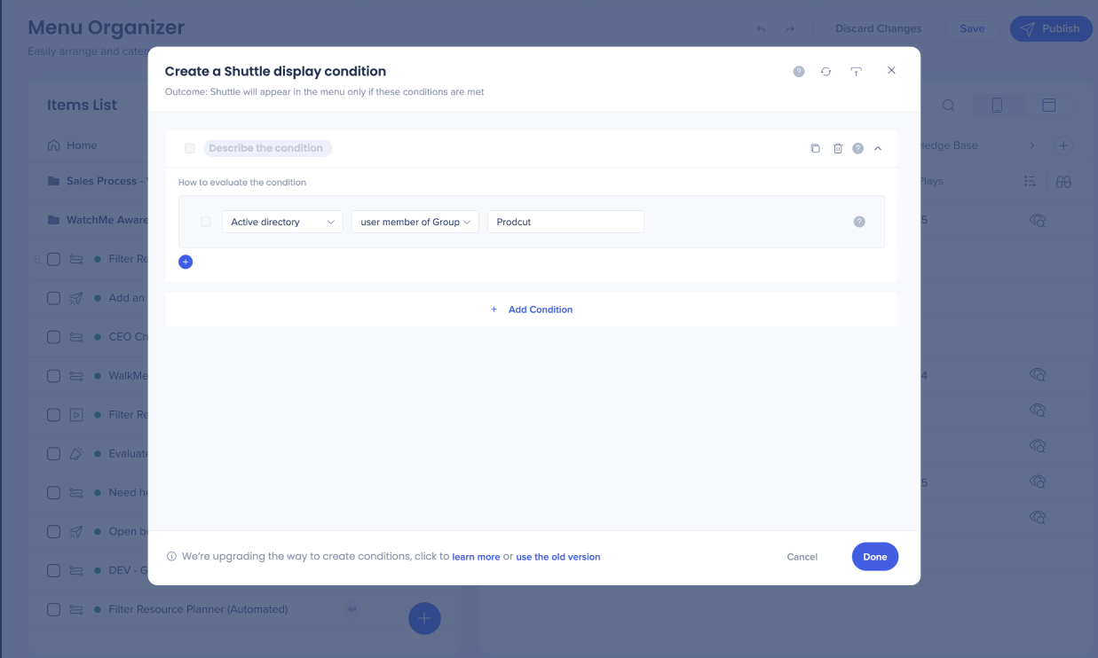You can access the menu organizer from the Menu app in the WalkMe Console or from the Apps shortcut in the WalkMe Editor.