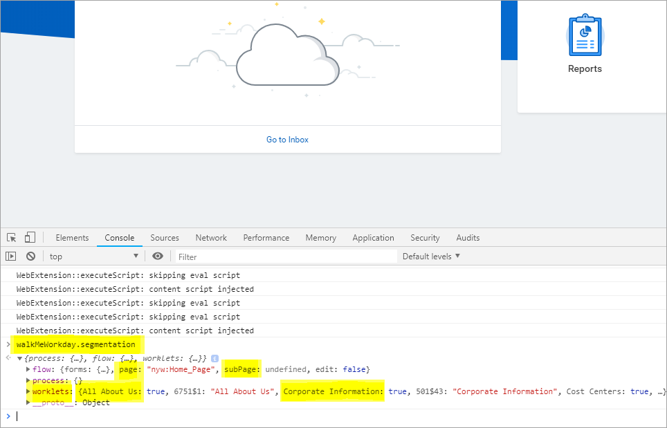 - Enter the command walkMeWorkday.segmentation.worklets into your web browser's dev tools Console tab.