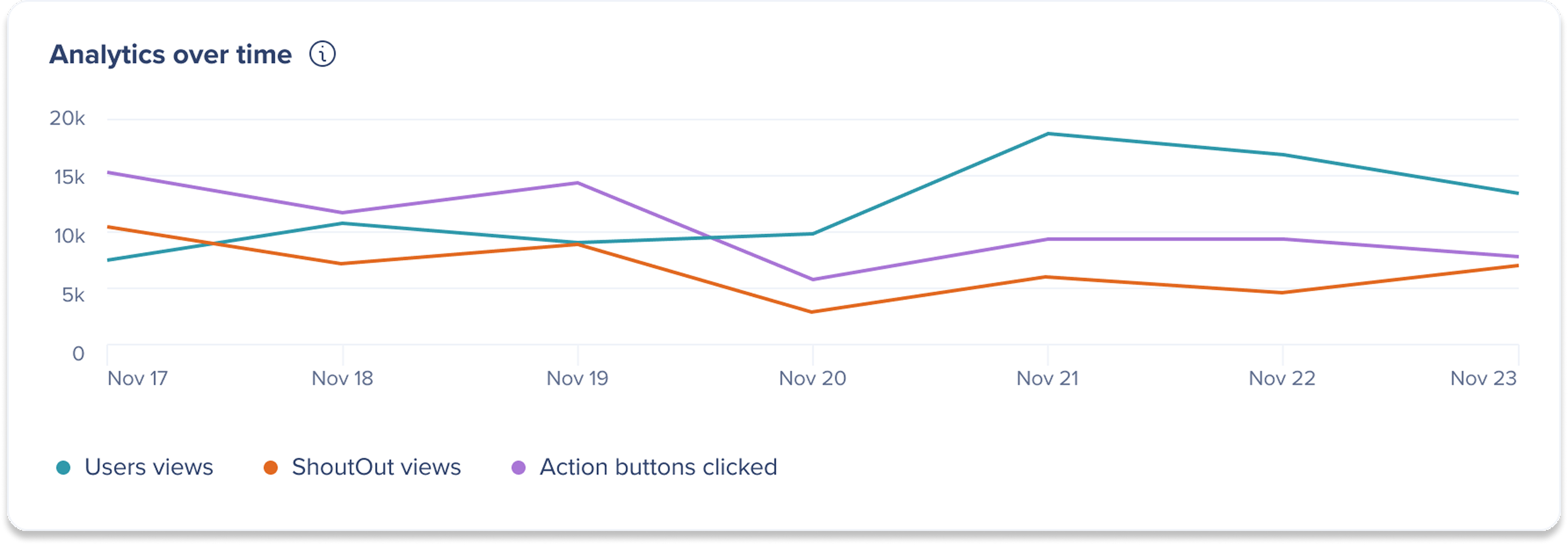 - Ele visualiza contagens de visualizações de usuários, visualizações de ShoutOut e botões de ação clicados, permitindo comparar padrões de engajamento e identificar picos, quedas ou alterações no comportamento