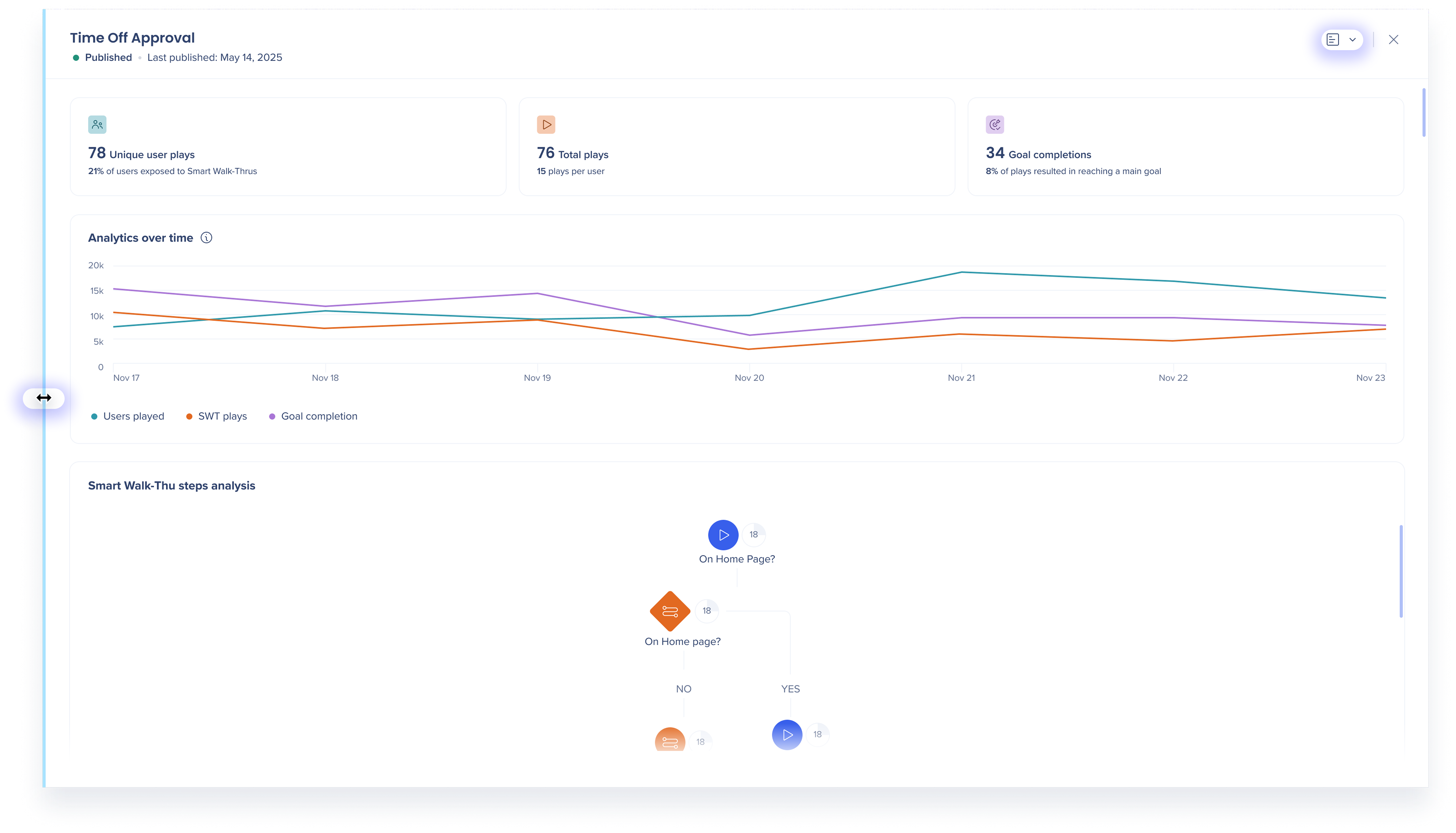 - Ele visualiza as contagens de usuários que executaram, as reproduções do Smart Walk-Thru e a conclusão da meta, ajudando você a entender quantos usuários iniciaram um Smart Walk-Thru, com que frequência ele foi executado e com que sucesso os usuários concluíram a meta definida.
