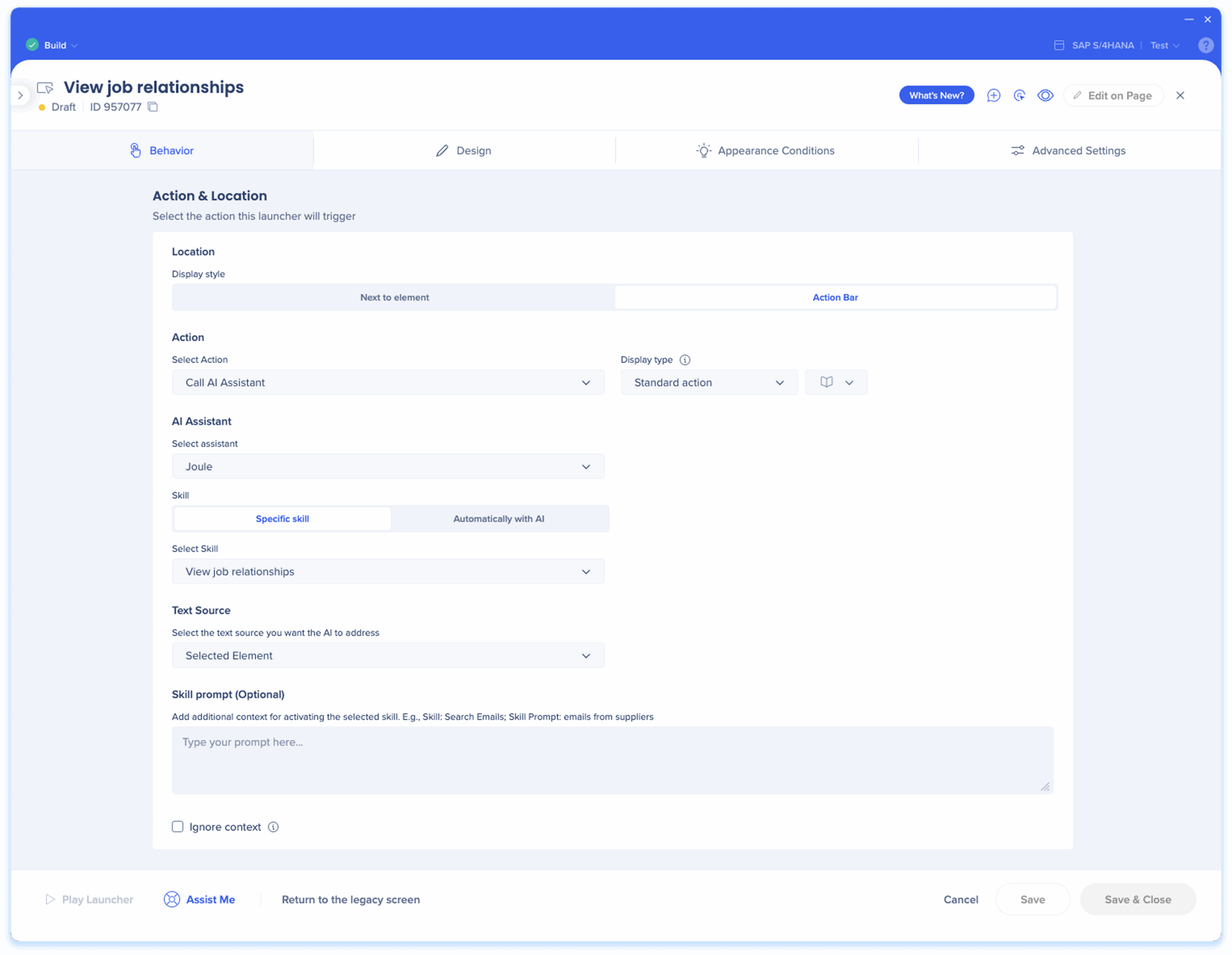 Os lançadores Smart-match permitem que você forneça a habilidade Joule certa aos usuários no momento em que for mais útil, oferecendo assistência antes mesmo que os usuários saibam que precisam dela. Esses lançadores usam lógica condicional, permitindo que eles reconheçam o contexto relevante e apresentem ações úteis exatamente quando os usuários podem precisar delas.