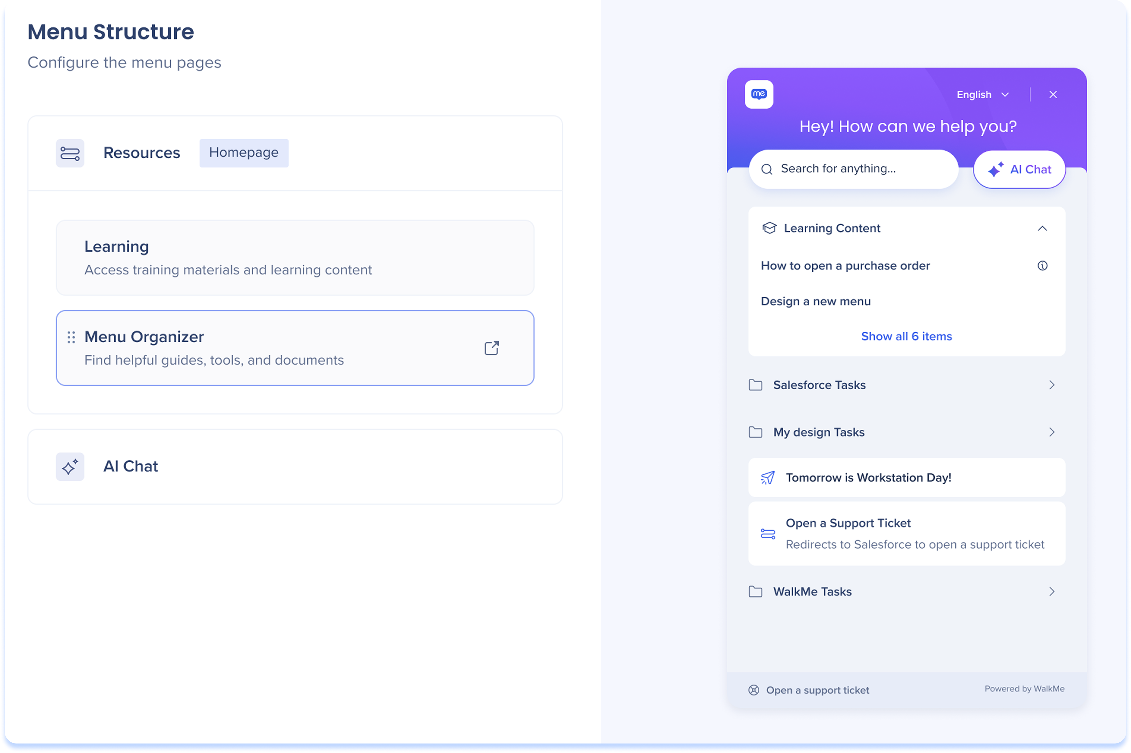 A configuração do widget ainda é controlada no Editor WalkMe.