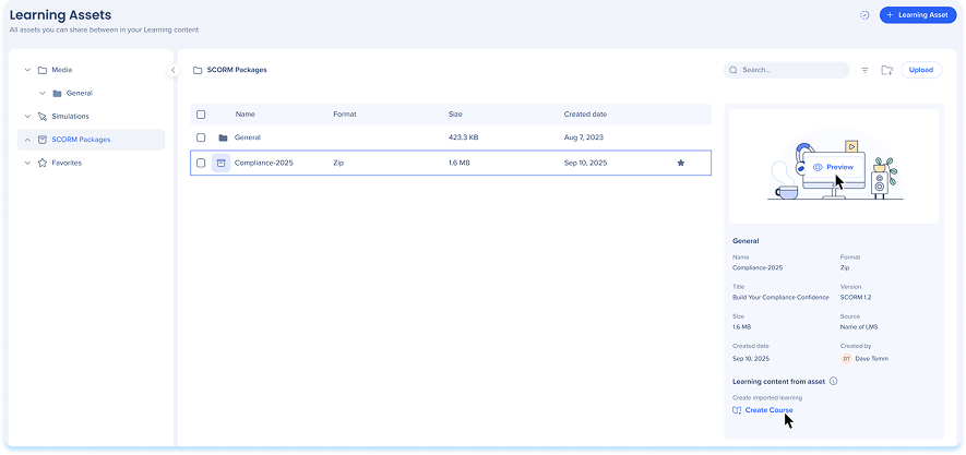 No painel de visualização de ativos, você pode criar um curso usando o conteúdo SCORM importado.