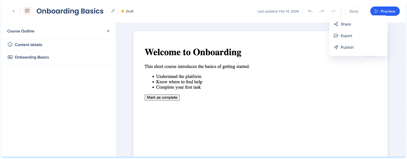 O recurso de importação SCORM permite trazer conteúdo SCORM existente para o Arco de Aprendizado da WalkMe e transformá-lo em um curso publicável. Isso é útil quando você já gerencia conteúdo de treinamento em ferramentas de criação externas, como o Articulate 360, e deseja entregá-lo por meio do portal.