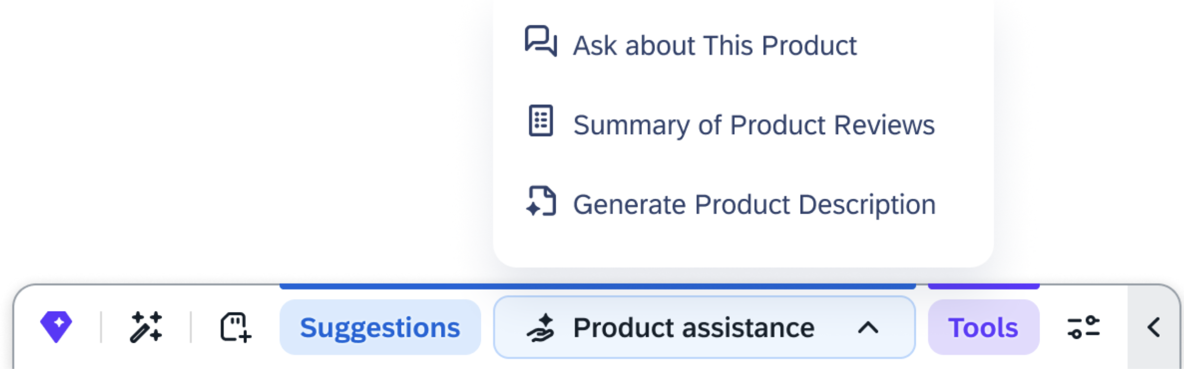 Quando os usuários estão na página de detalhes do produto na Commerce Cloud, o menu de Assistência do Produto será exibido na barra de ações Joule com as seguintes ações:
