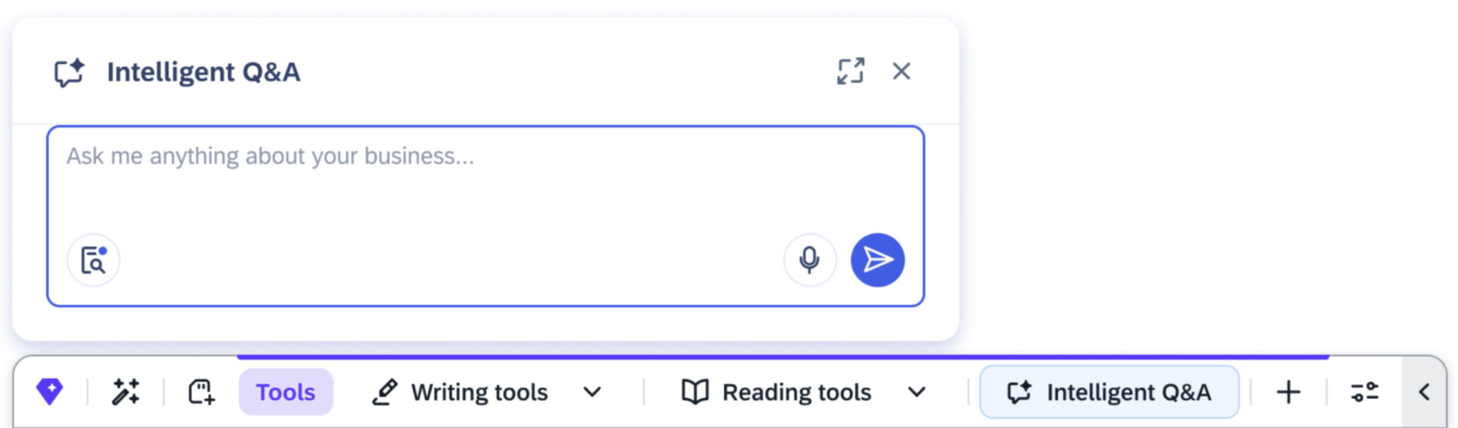 A barra de ações pode ser integrada ao SAP CX AI Toolkit, trazendo habilidades de IA focadas na experiência do cliente diretamente para o fluxo de trabalho do usuário. Com essa integração ativada, os funcionários obtêm assistência de IA baseada no contexto para tarefas como resumir dados de clientes, gerar descrições de produtos ou participar de perguntas e respostas inteligentes, sem sair do aplicativo.