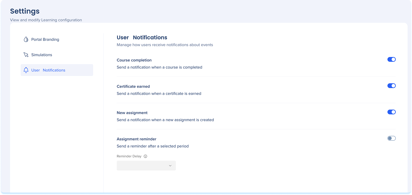 Notificações de usuário são notificações por e-mail acionadas pelo sistema enviadas aos alunos quando ocorrem eventos importantes de aprendizado, como a atribuição de um curso ou a obtenção de um certificado. Esses e-mails ajudam os alunos a entender qual ação é necessária e a manter-se informados sobre o progresso de aprendizagem. Cada notificação por e-mail pode ser ativada ou desativada globalmente. Quando ativado, os e-mails são enviados automaticamente quando o evento relacionado ocorre.