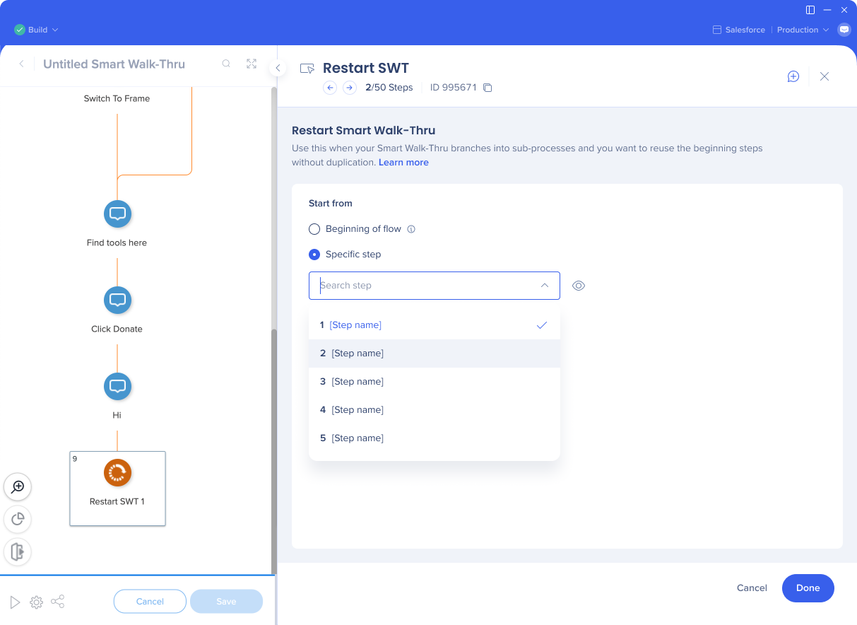 Você tem um Smart Walk-Thru que se ramifica em vários subprocessos? Usando Reiniciar a etapa Smart Walk-Thru permite que o usuário passe pelo mesmo Smart Walk-Thru várias vezes para que você possa reutilizar as etapas iniciais. Em determinadas situações, isso permite que você construa com mais eficiência sem precisar duplicar um Smart Walk-Thru.