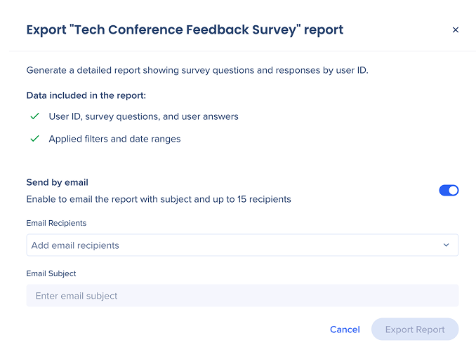 Você pode gerar um relatório detalhado das perguntas e respostas da pesquisa dos usuários.