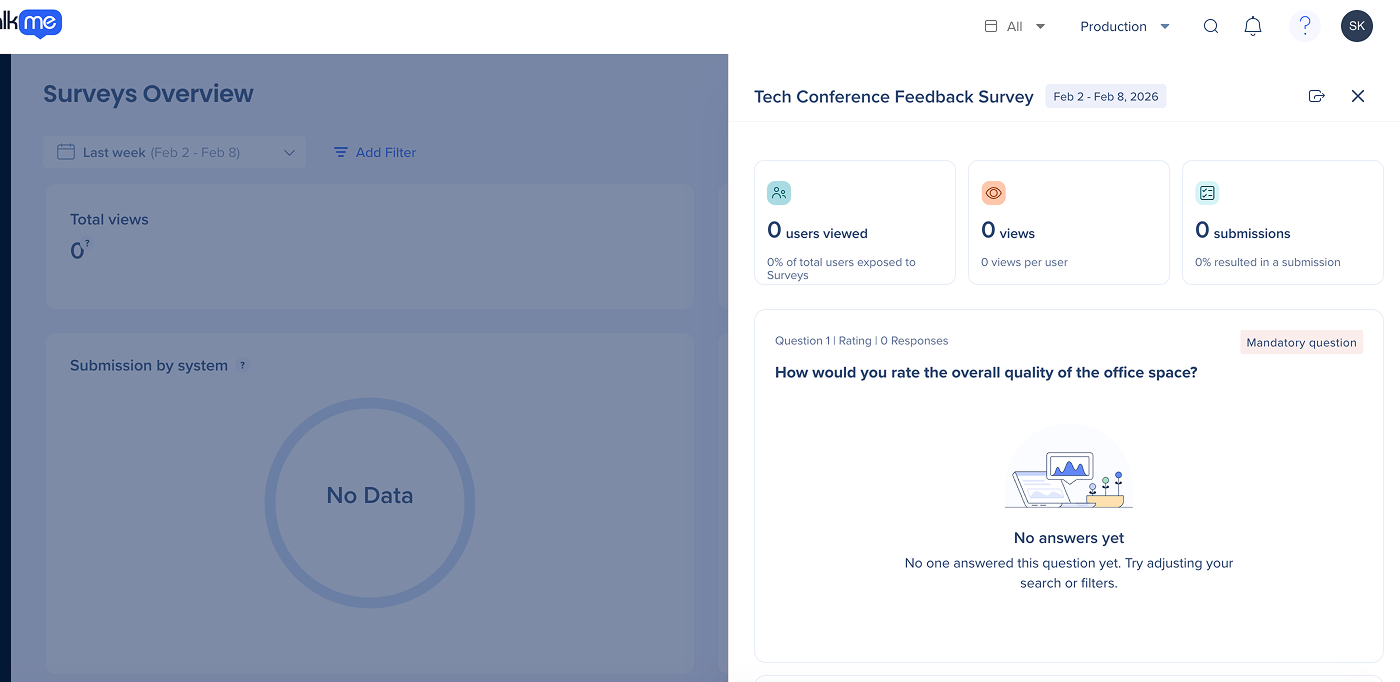 A página Visão Geral das Pesquisas serve como um hub centralizado para analisar o desempenho das pesquisas em toda a conta. Ele fornece métricas de engajamento de alto nível e insights detalhados específicos da pesquisa. Isso ajuda você a entender as interações dos usuários com pesquisas, estejam elas vinculadas a sistemas específicos ou compartilhadas como experiências de página inteira. Isso ajuda a otimizar a eficácia da pesquisa e fornece uma visão abrangente do envolvimento do usuário.